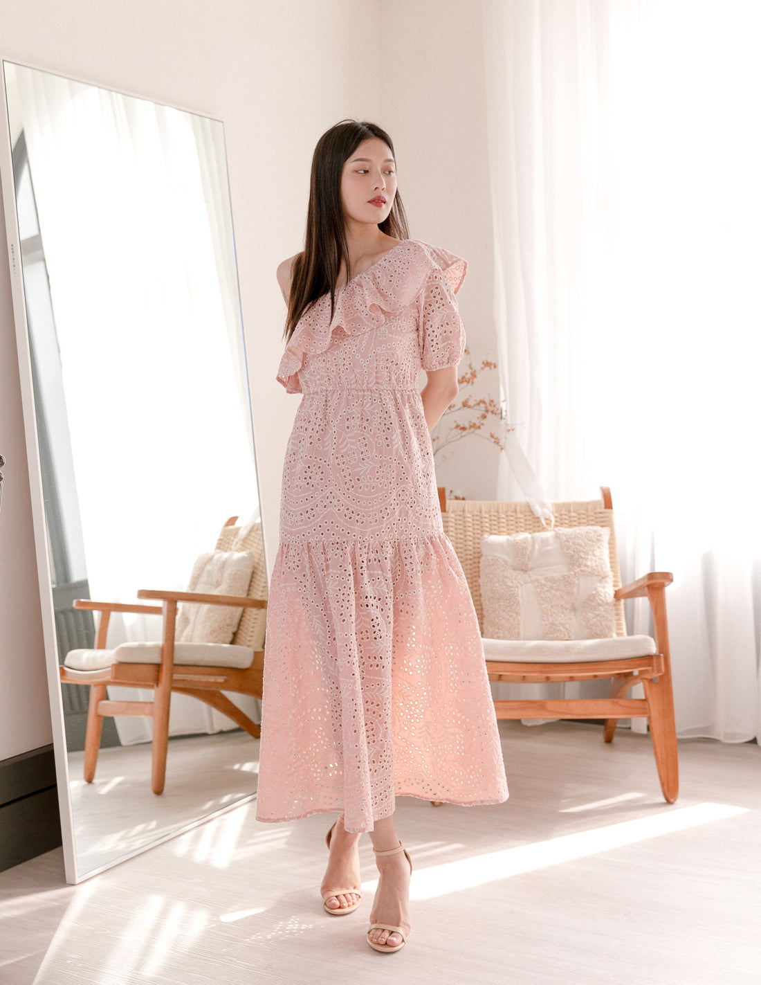 Janelle Asymmetrical Shoulder Dress in Burgundy